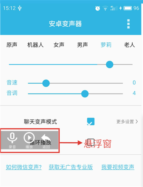 3、点悬浮窗播放,会先倒计时两秒再放变声后的声音,悬浮窗上倒计时为1时按住微信的录音键,直到变声语音播放完后再松开发送出去