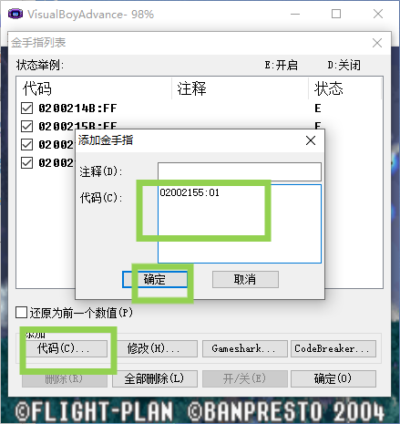 2、点击代码按钮打开对话框,在对话框代码区输入金手指代码。