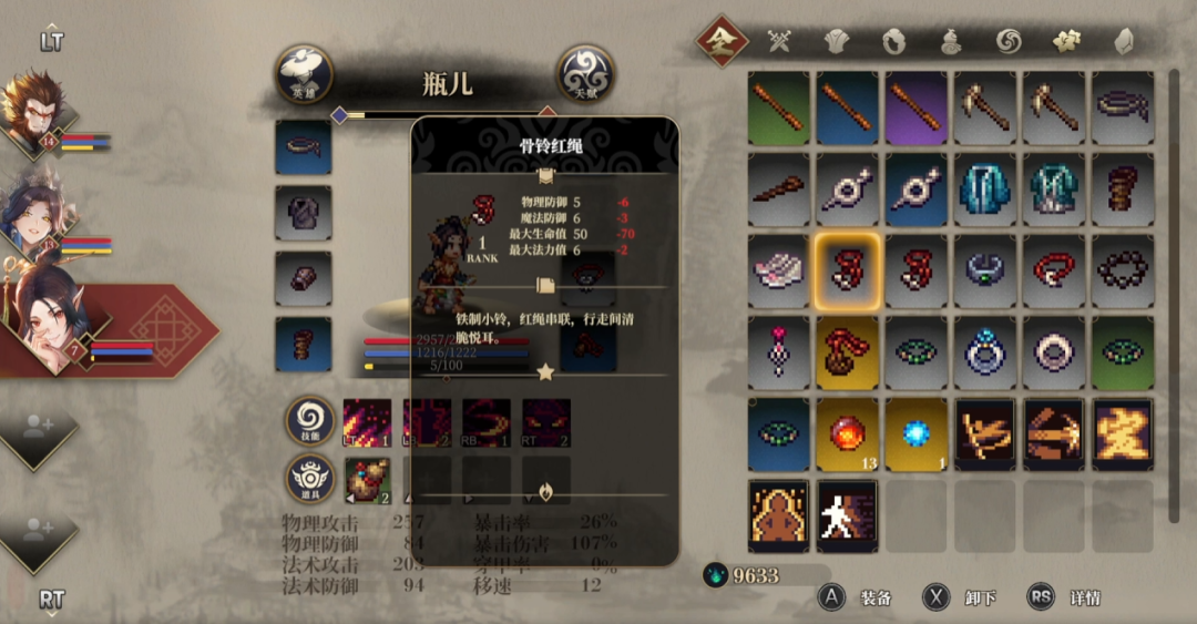 战斗过程中,要注意自身的血条,法力条,体力值,怒气值,四项技能和携带的装备。左边的葫芦喝了回血,右边的技能栏在后续甚至可以学会定身法。